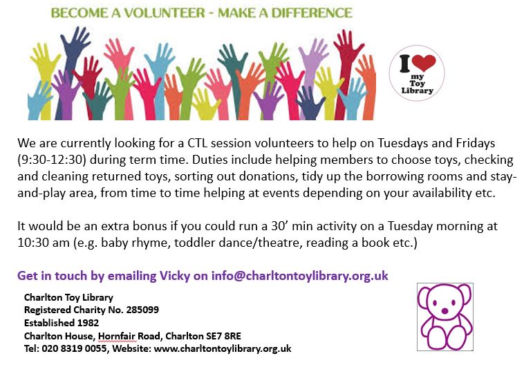 Do you have a few hours to spare every week? Would you like to help your local charity? We would love to hear from you, please email Vicky on info@charltontoylibrary.org.uk.